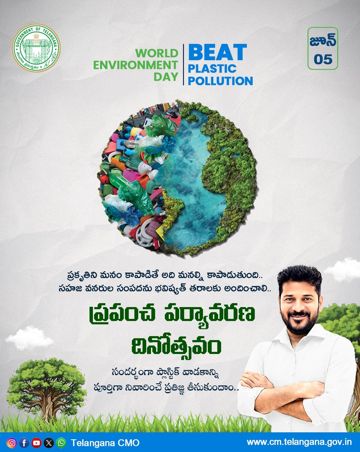 ప్రపంచ పర్యావరణ దినోత్సవం సందర్భంగా పర్యావరణ పరిరక్షణకు ప్రతి ఒక్కరూ కార్యోన్ముఖులు కావాలని ముఖ్యమంత్రి శ్రీ ఎ. రేవంత్ రెడ్డి గారు. ప్రకృతిని మనం కాపాడితే అదే మనల్ని కాపాడడం. ఈ ఏడాది పర్యావరణ దినోత్సవం ప్రధానాంశమైన ప్లాస్టిక్ నియంత్రణకు కట్టుబడి ఉందని. సహజ వనరుల సంపదను రాబోయే తరాలకు అందించాలన్నదే ప్రజా ప్రభుత్వ ధృక్పథమని పేర్కొన్నారు.